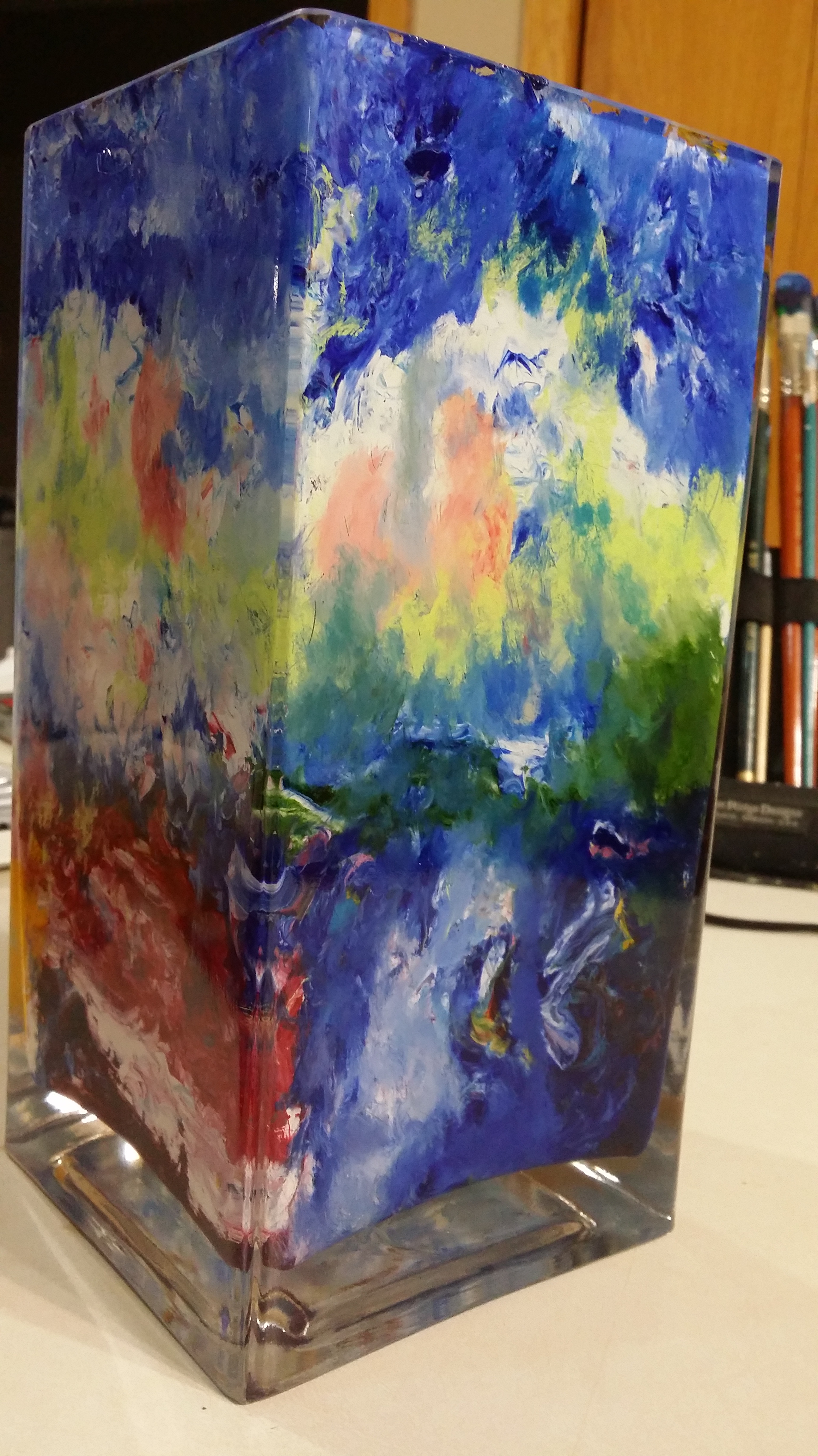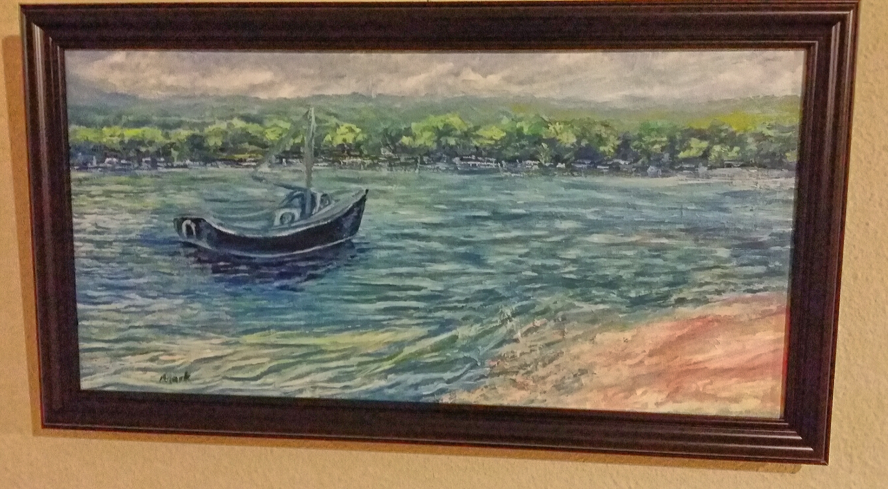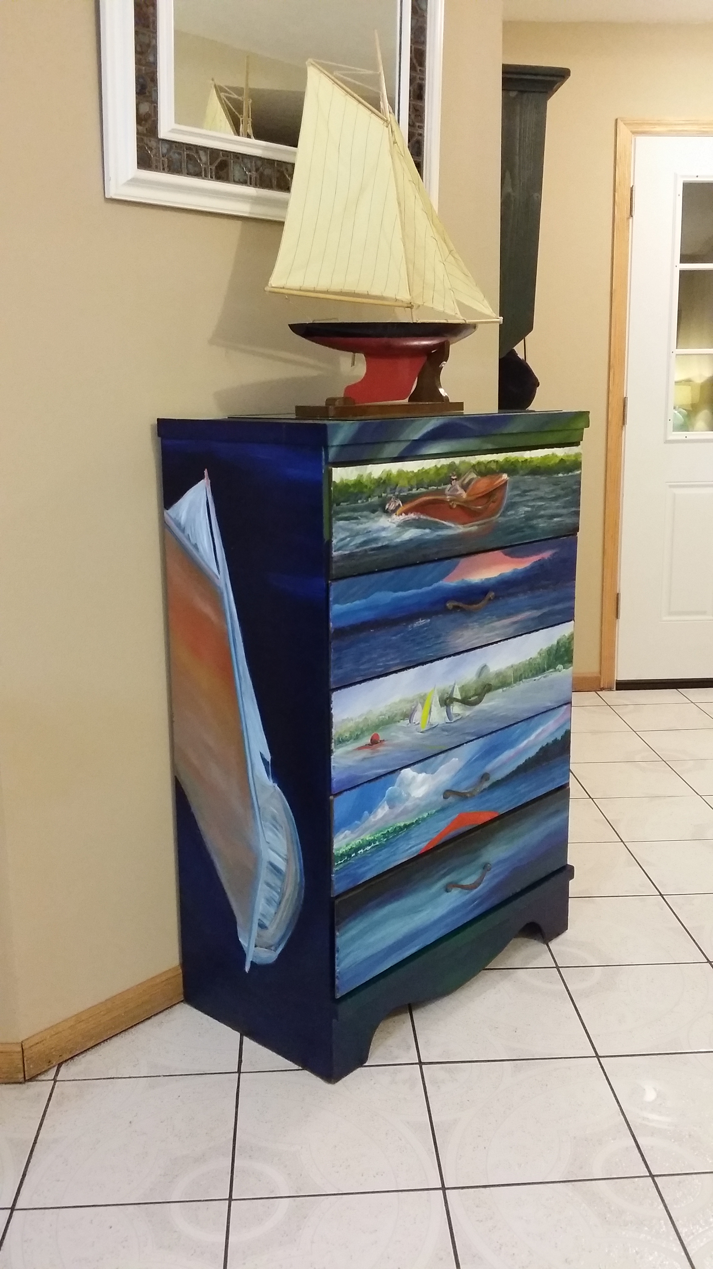 A free dresser found on a curb side was the first project. As ugly as it was I begrudgingly loaded it up and took it away. My mom said to paint it, so I took her advise. She thought a solid color would work but I had other plans. With 5 drawers, the top, and two sides turned into 8 separate paintings. I enjoyed each step making the lake scenes come to life.