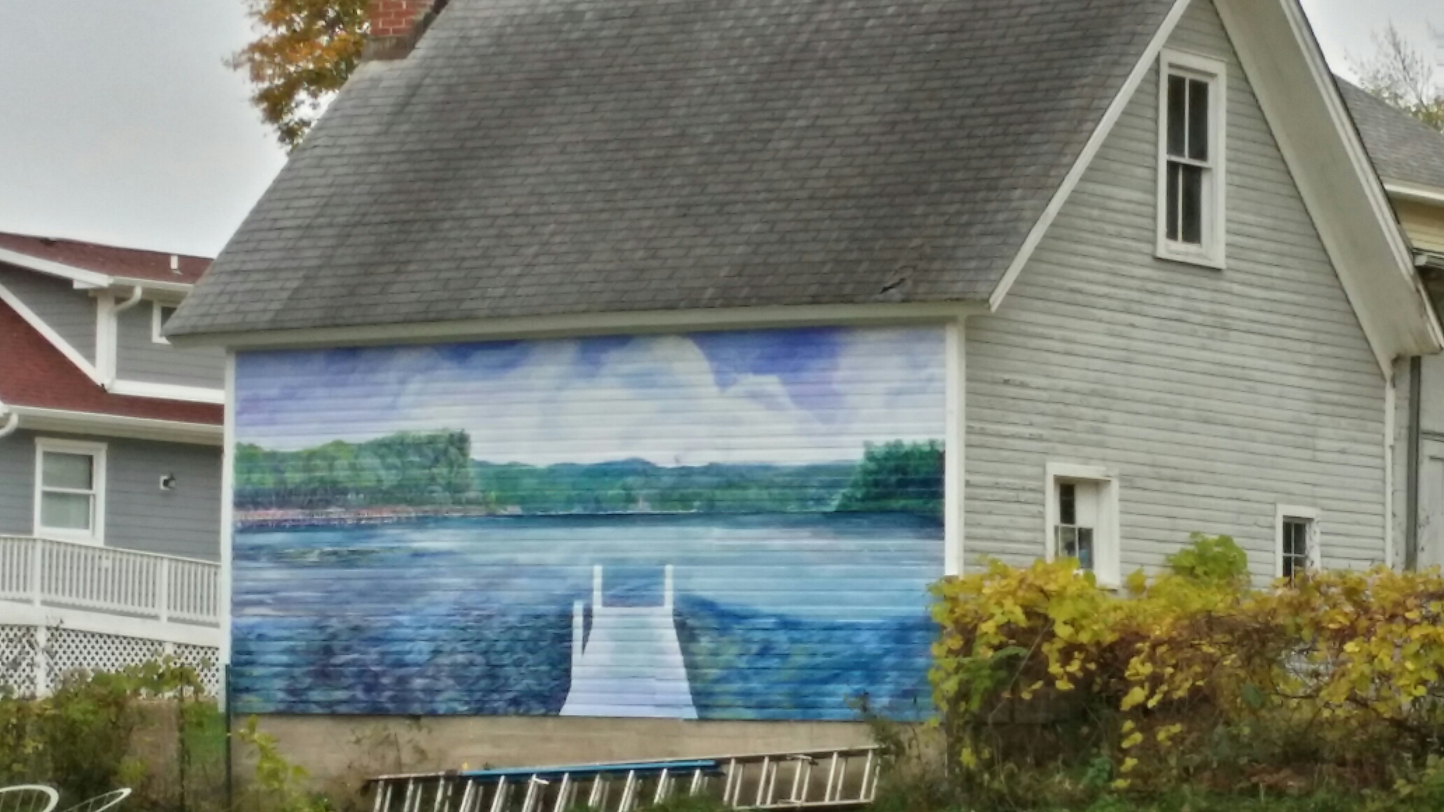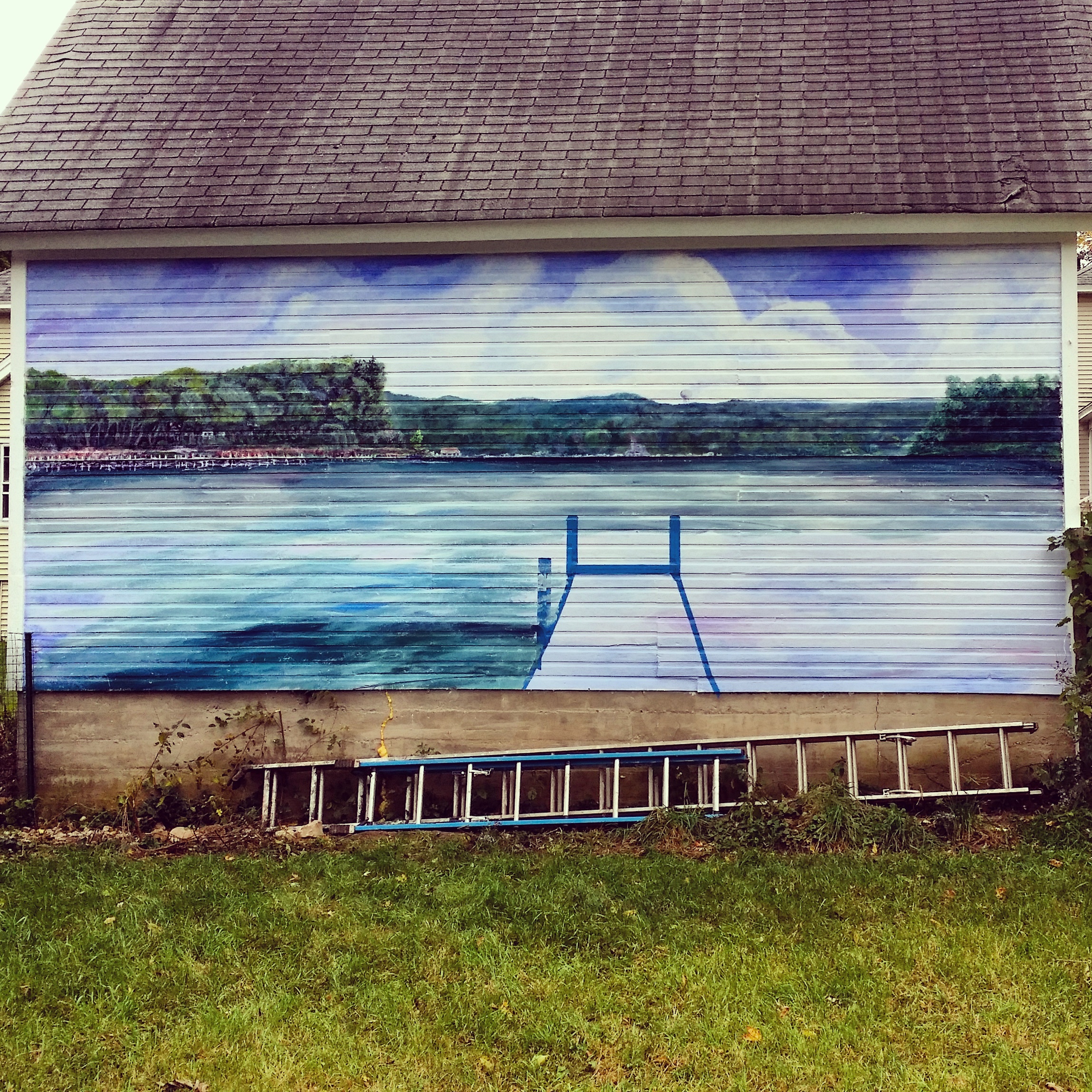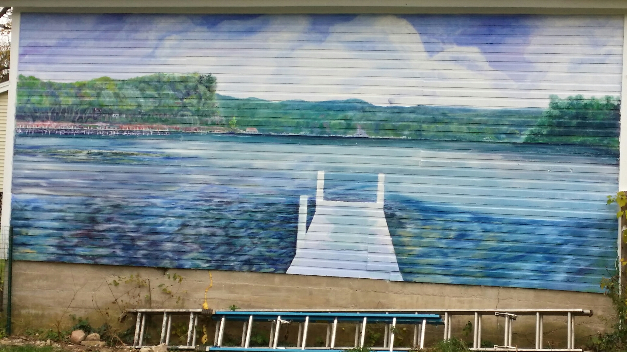 I am in the mix of going really big for a Geneva Lake mural at Mike and Laurie VanderBunt ‘ s vacation rental. The wall is adjacent the back yard on a neighbors garage. The project is taking shape as the challenging details are yet to come. I like the fact that all the colored blobs look fine from the street.