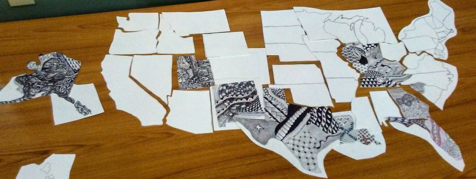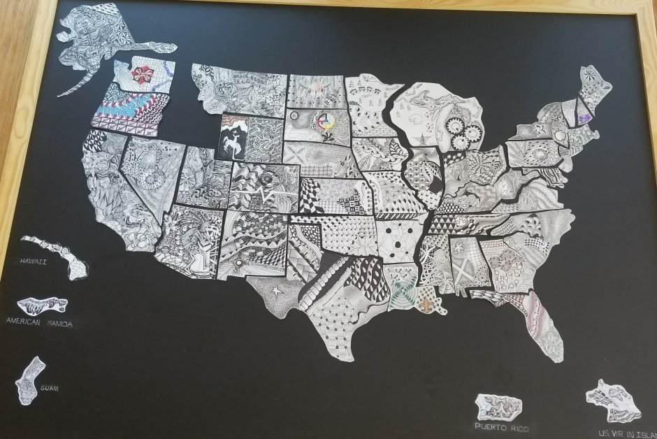 I have been teaching the Zentangle method to vets at the VA in Milwaukee for the past year and a half. We are in the process of a U.S. map project where myself and other vets are tangling each individual state and then combining them as a group entry into the Veterans Creative Art competition. I will be posting our progress leading up to the show starting in February of 2018. If we win in Milwaukee then we are entered into the national show.
